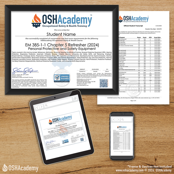 As an OSHAcademy student, you have free access to all our training materials, including knowledge checks and course activities. Documentation of your training, such as exam scores, certificates, and transcripts, can be accessed by purchasing a certificate package.
