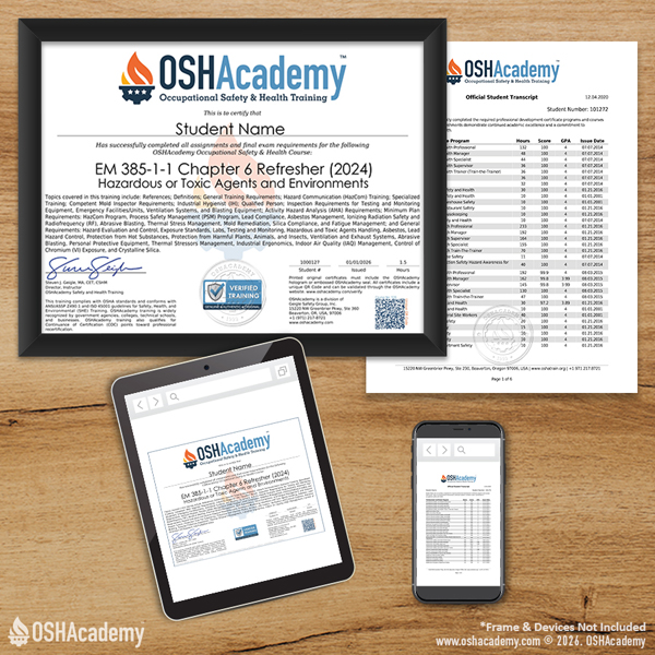 As an OSHAcademy student, you have free access to all our training materials, including knowledge checks and course activities. Documentation of your training, such as exam scores, certificates, and transcripts, can be accessed by purchasing a certificate package.