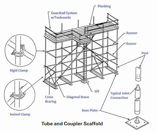 - Tube and coupler scaffolds must have posts, runners, and bracing of nominal 2 in (5 cm) (outside diameter) steel tubing or pipe: other structural metals, when used, must be designed to carry an equivalent load. The size of bearers (outside diameter) and the spacing of posts must meet the requirements contained in ANSI A10.8.