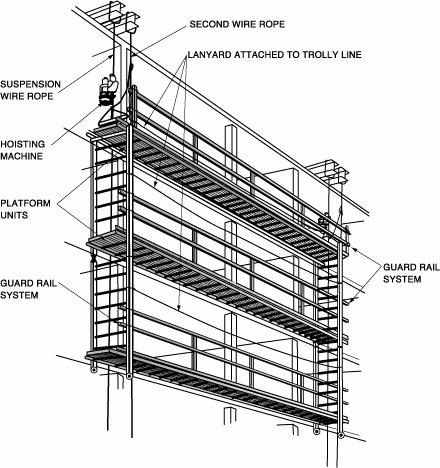 - The platform must be suspended by wire ropes from overhead outrigger beams.