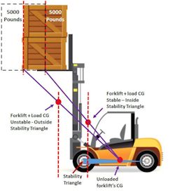As the load is raised, it becomes possible for the forklift to fall to the side as well as tip forward because the combined center of gravity (CG) might move outside the stability triangle.
