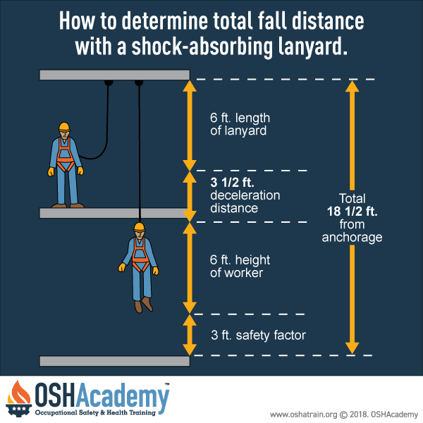 Because a shock-absorbing lanyard extends up to 3.5 feet, it's critical that the lanyard stops the worker before the next lower level. Allow about 20 vertical feet between the worker's anchorage point and the level below the working surface. Always estimate the total distance of a possible fall before using a shock-absorbing lanyard.