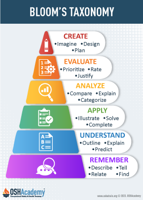 Bloom's Revised Learning Taxonomy below is adapted from “A Taxonomy for Learning, Teaching, and Assessing: A revision of Bloom’s Taxonomy of Educational Objectives,” edited by Lorin W. Anderson and David R. Krathwohl. Bloom's Revised Taxonomy is an excellent tool for developing operational learning objectives, planning instruction and choosing assessment methods.