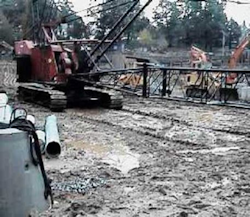 A crew of ironworkers and a crane operator were unloading a 20-ton steel slab from a low-boy trailer using a 50-ton crawler crane with 90-foot lattice boom.