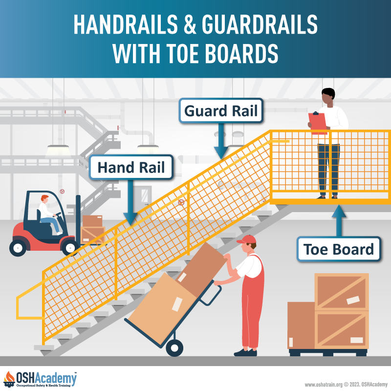 Measure the height of the handrail. The standard height for handrails is 42 inches measured from the floor to the top of the rail. Check that each rail is straight, smooth and securely attached. Where the rail is exposed to lifting activities, check that it is safety bolted into the pockets to prevent them from being lifted out and dropped. Confirm that all rails have an intermediate rail halfway between the floor line and the top rail and that they have a toe board at least 4 inches tall to prevent tools from being kicked off the edge.